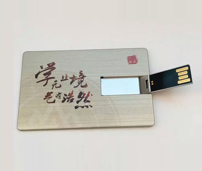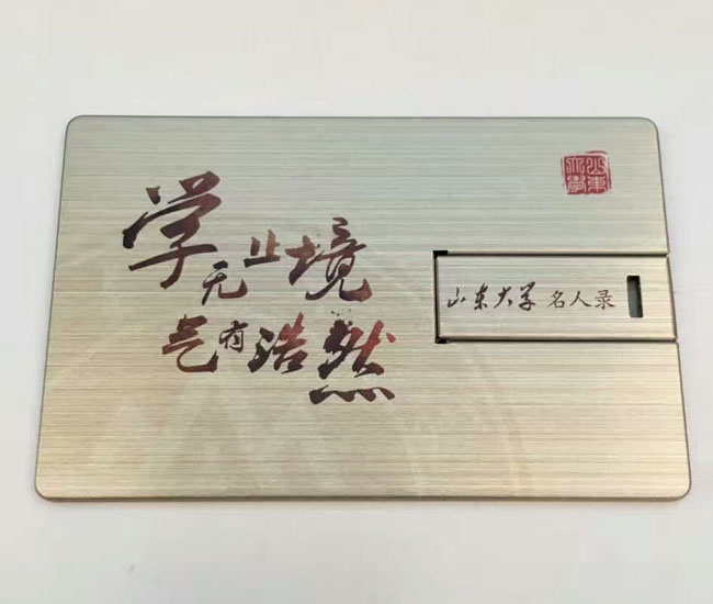 金屬拉絲卡片式U盤 山東大學定做名人錄名片U盤禮品,山東大學U盤是深圳定制U盤廠家設計并制作而成,金屬卡片U盤雙面高清印刷山東大學校訓,很具有校園氣息.金屬超薄拉絲外觀彰顯尊貴好禮,名片U盤表面可印上貴司有特色的LOGO宣傳資料、聯系資料,比普通名片要美觀。