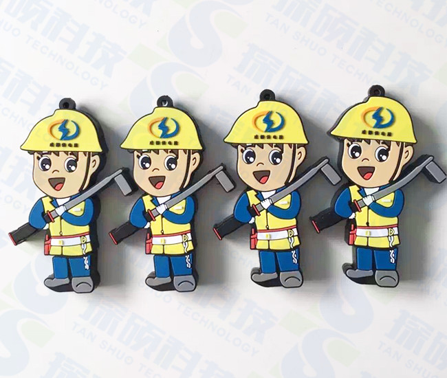 小人造型U盤 成都供電局開模定做供電工人U盤紀念品,這款水電工U盤是我們探碩U盤工廠設計定制,采用環(huán)保PVC材質制作,平面2d開模款,卡通人造型,正面是帶著安全帽的水電工形象,黃色的安全帽,還有電工常用的工具,站立的電工一身工作服,非常的嚴肅,這也是日常生活中電工的具體形象,安全帽上有成都供電段5個漢字,還有供電所logo標志,電工U盤非常形象的展示了電工的風采。