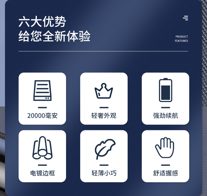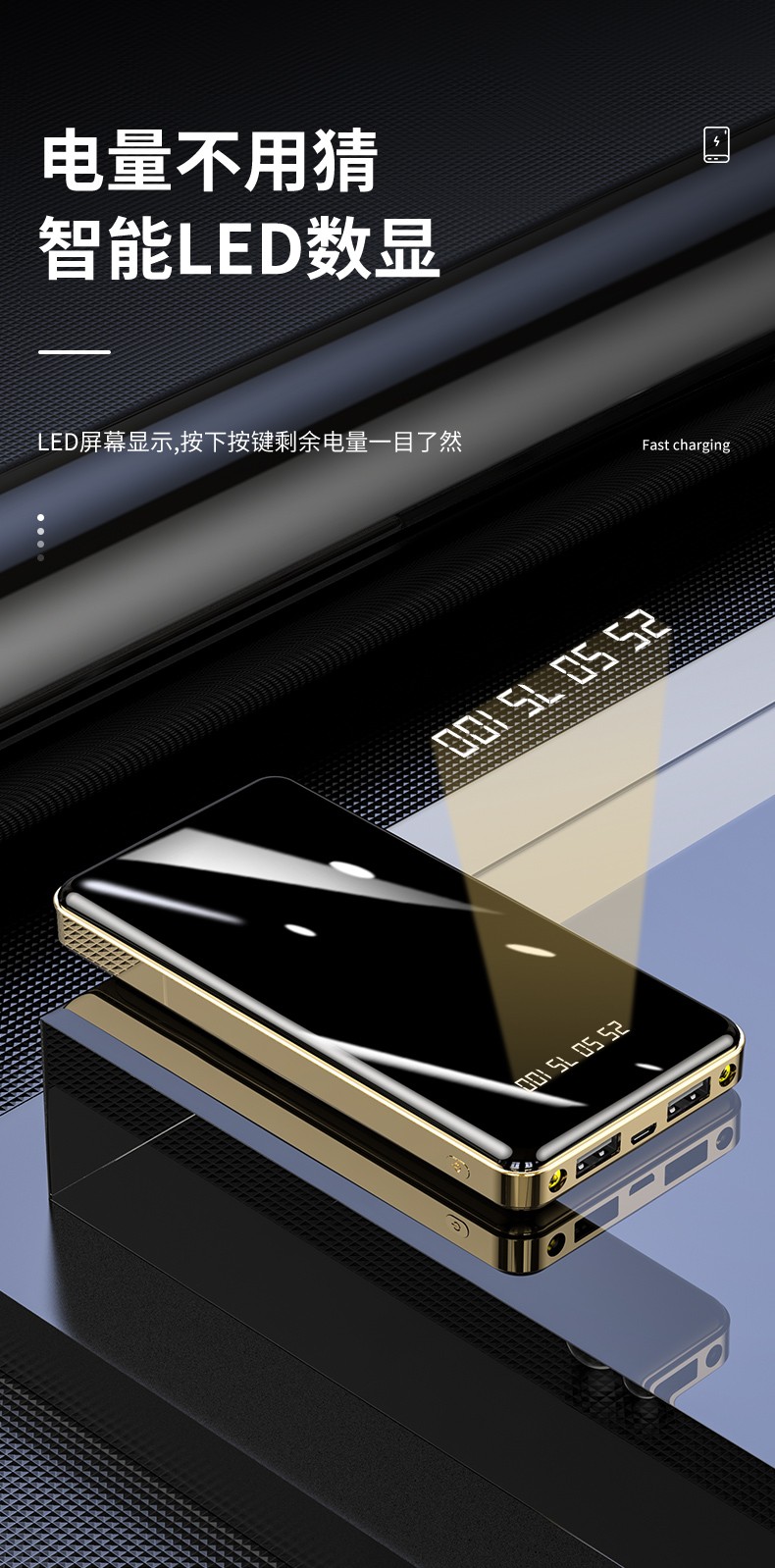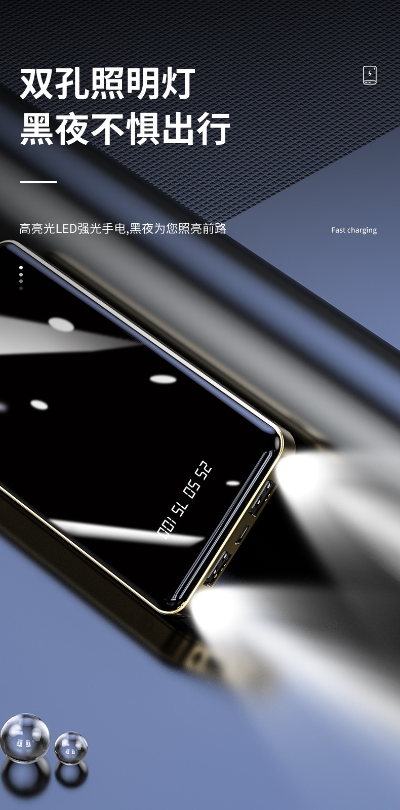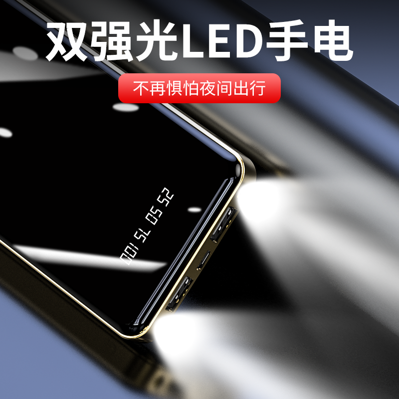 產品功能:數字電量顯示;雙USB輸出,Type-c+Micro雙輸入;自帶強光手電筒