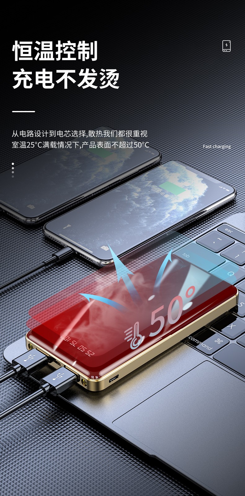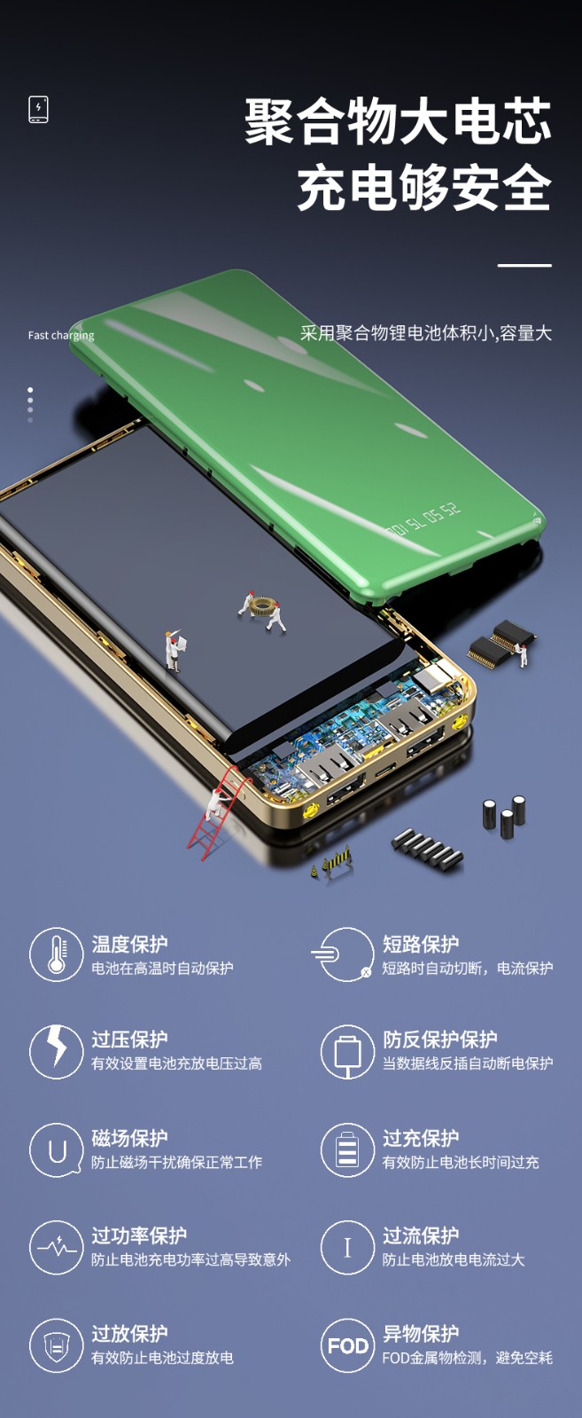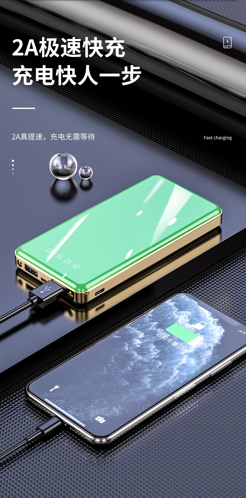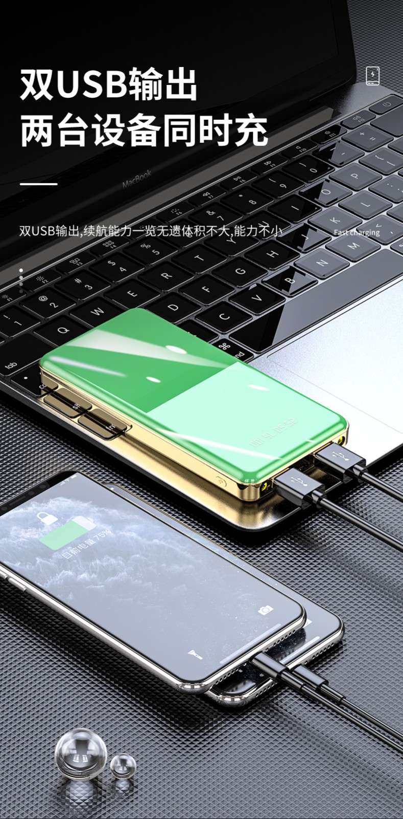 產品功能:數字電量顯示;雙USB輸出,Type-c+Micro雙輸入;自帶強光手電筒