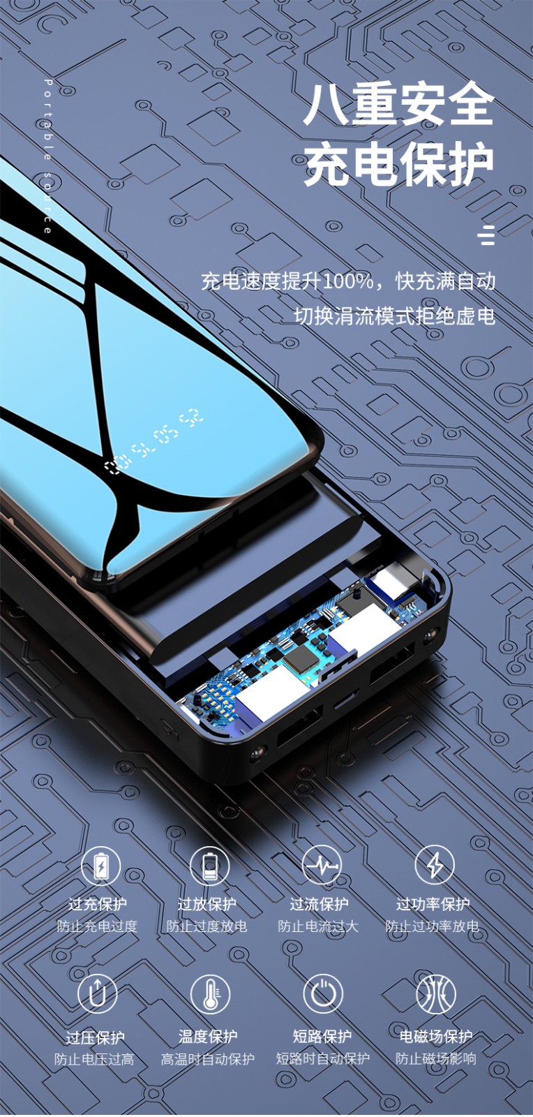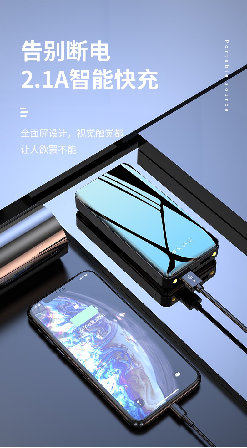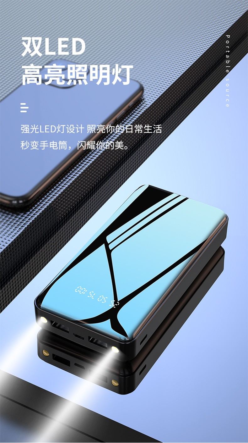 產(chǎn)品功能:數(shù)字電量顯示;雙USB輸出,Type-c+Micro雙輸入,2A輸入輸出;自帶強(qiáng)光手電筒;